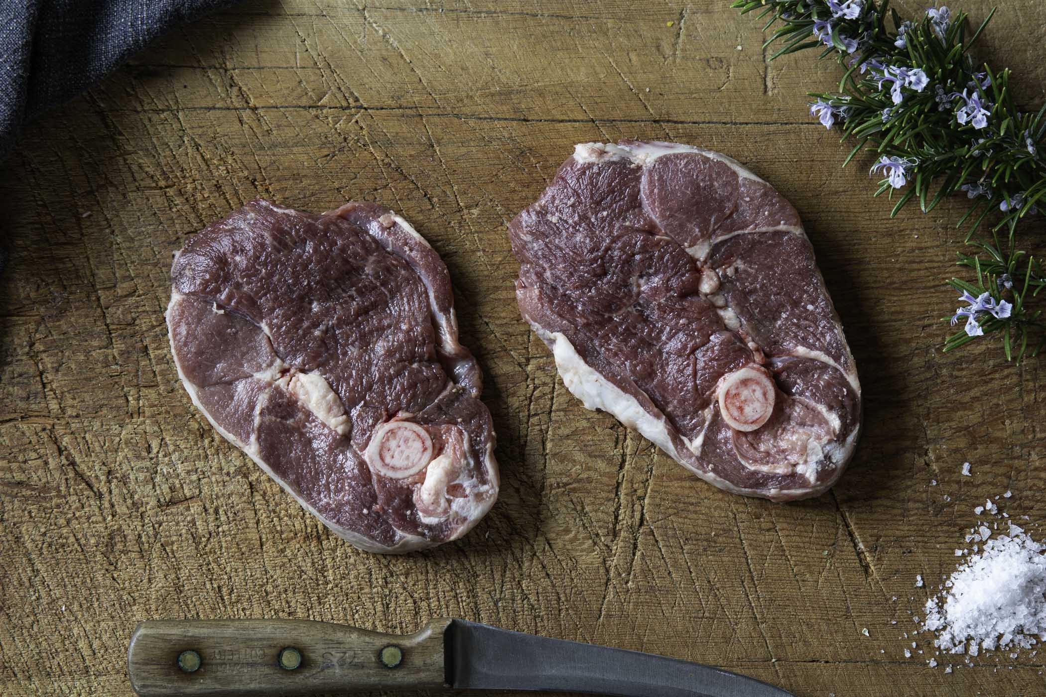 Hogget bone-in leg steaks AKA hogget ossobuco from Garry Schofield's pure breed Swaledale hogget*. From sheep farmed on the slopes of the stunning valleys of Upper Wharfedale, above the picturesque village of Buckden. Older than lamb, hogget develop at their own pace and have the best part of two summers grazing on lush, nutrient-rich meadows producing deeply flavoursome, exceptional quality meat with a moderate covering of fat.
