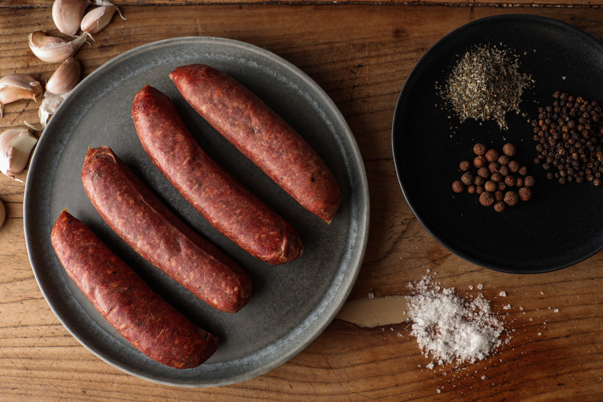 Pork shoulder and belly (60%), beef brisket and chuck (25%), spring water, coarse sea salt, fresh garlic, ground black pepper, ground paprika 80 ASTA, continental curing salts, preservative (sulphur dioxide), ground allspice, marjoram leaf.