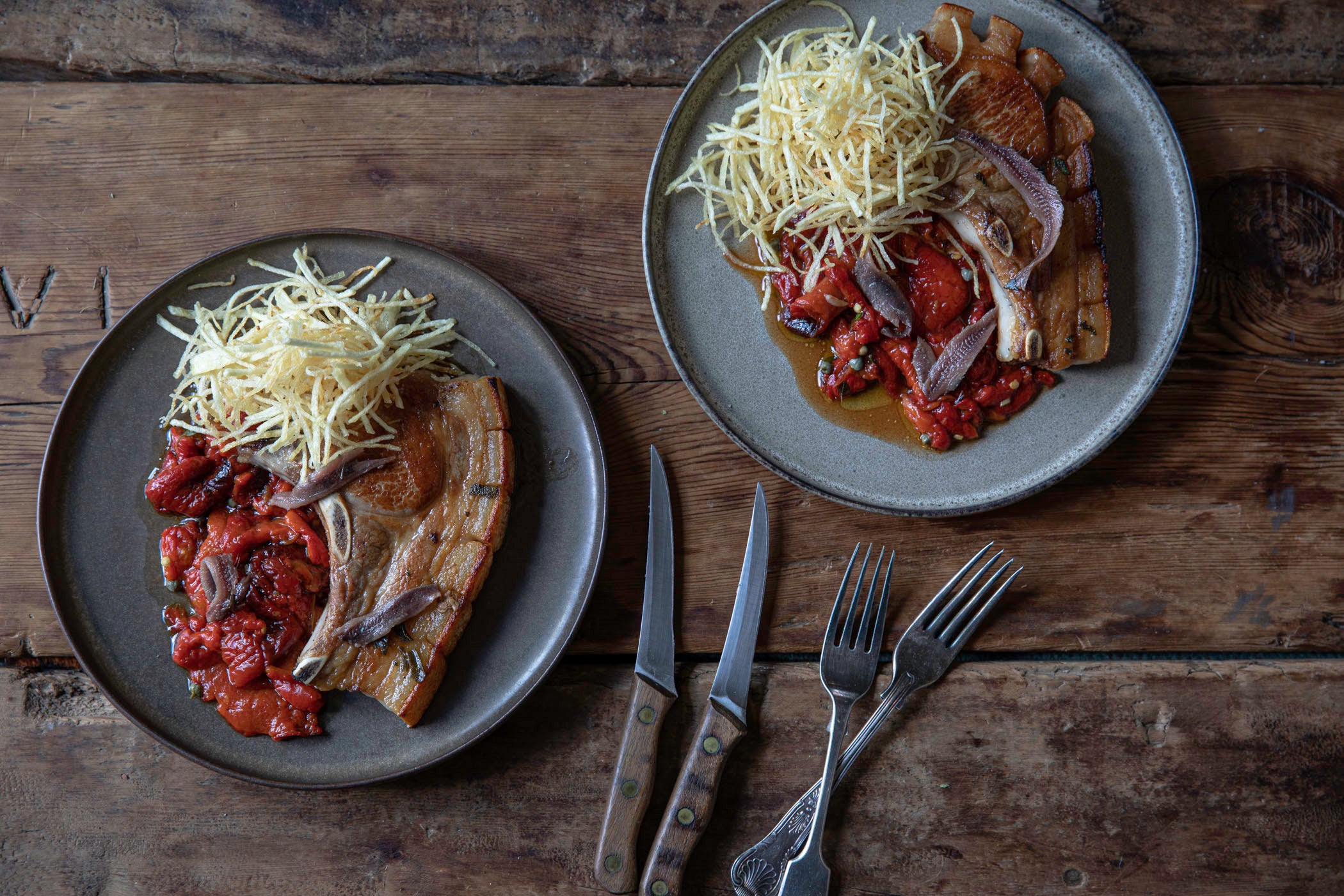 "Question is, why would you ever have a thin-cut pork chop? These Swaledale chops are well fatted, so important for a juicy result. For such a chop, a pre-cook of the rind is important for those seeking crackling. Score the skin with a very sharp knife in vertical cuts along the length of the chop. Heat some oil in the frying pan and stand the chop on its rind. If tempted to fall to one side, then simply clamp it between two wooden spoons resting on each side. Slowly cook the skin until it’s become coloured, blistered and crisp. Then fry it hard and briskly on one side with your chosen seasoning until coloured. Flip it onto its raw side and put straight in the oven where the raw side will colour.